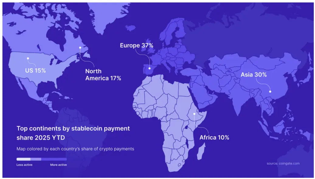 At the gold end, the change is even more significant: in 2025, 85 per cent of commercial settlements on the CoinGate platform chose to be issued in stable currency. This suggests that, for enterprises, the stabilization currency is no longer just another payment option, but is the preferred settlement layer for cross-border settlements, remittances and B2B flows。