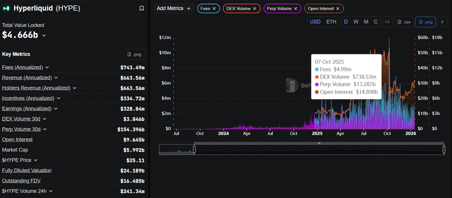 DefiLlama では、Hyperliquid が非常に高い毎日のターンオーバー/TVL 比率を長時間維持していることを観察できます。 これは単なる“ ブラシ” それは、システムへのモビリティが補助金を待っているプールで横切るのではなく、高周波と強度で使用されている明確な信号の結果です。 資本効率は、多くの場合、トレーダーが高品質であることを意味します。